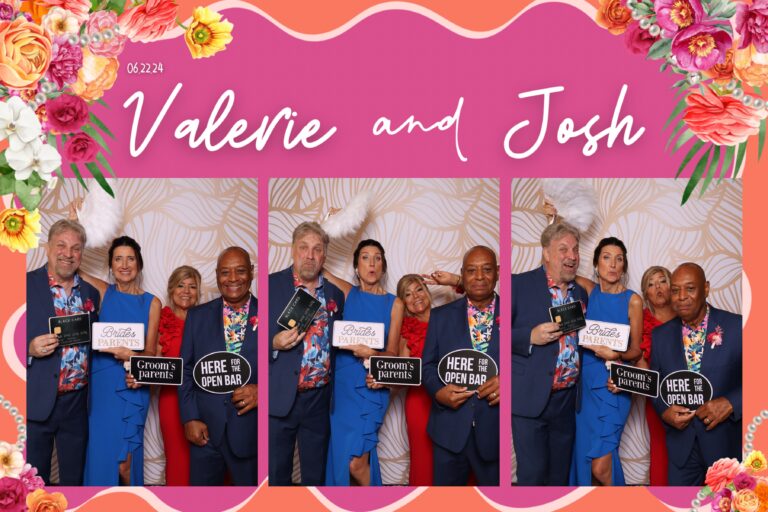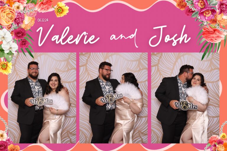 Nestled on the pristine shores of Clearwater Beach, the Sandpearl Resort is a premier wedding destination. With its luxurious amenities and picturesque views, it offered the perfect backdrop for a tropical-themed wedding. The resort’s elegant setup and serene ambiance made it an ideal location for the couple to exchange their vows. The couple’s wedding theme was a burst of tropical colors and vibrant decor. Bright flowers, lush greenery, and tropical accents transformed the venue into a paradise. This theme was reflected in every detail, from the bridesmaids’ dresses to the table settings, creating a cohesive and lively atmosphere that guests loved. We made sure to tie in the colorful details into the idle/display screen of our Studio Photobooth.